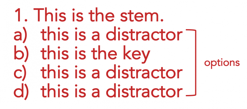 Distractors should be plausible and based on the misconceptions and mistakes commonly made by students. This means that they can be diagnostic – what the student chooses will tell you something about what they know/don’t know, where they’re going wrong, etc.