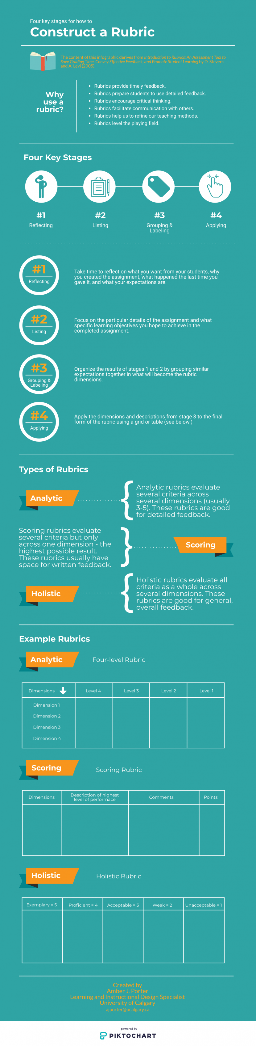 Having a well-designed rubric for your course assignment can be a very useful tool, but as anybody who’s created rubrics can tell you, they’re not the easiest thing to design. In the past my approach has been to start with someone else’s rubric and adapt it for my purposes. I still think having examples and templates is incredible useful and inspiring, but after readings Stevens and Levi’s (2005) Introductions to Rubrics: An Assessment Tool to Save Grading Time, Convey Effective Feedback, and Promote Student Learning, I’ve learned the value of writing my rubrics from scratch. Stevens and Levi provide a relatively straightforward method for creating rubrics, which I have condensed down into the following infographic, along with some information on rubric types. This isn’t meant as a replacement for reading their book – I highly recommend it! – but it’ll give you an idea about how the process they created works and whether you think it might be valuable to you. I hope it is.